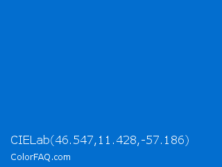CIELab 46.547,11.428,-57.186 Color is a normal blue color and the nearest color is True Blue #0073cf. Hex code #036ecf and RGB value is rgb(3,110,207). In RGB color space, this color is composed of 1% red, 43% green, 81% blue, In CMYK color space, this color is composed of 99% cyan, 47% magenta, 0% yellow , 19% black , In HSL color space, this color has a hue angle of 209° , 97% saturation and 41% lightness.