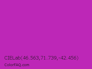 CIELab 46.563,71.739,-42.456 Color is a normal magenta color and the nearest color is Byzantine #bd33a4. Hex code #bd27b7 and RGB value is rgb(189,39,183). In RGB color space, this color is composed of 74% red, 15% green, 72% blue, In CMYK color space, this color is composed of 0% cyan, 79% magenta, 3% yellow , 26% black , In HSL color space, this color has a hue angle of 302° , 66% saturation and 45% lightness.