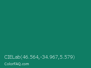 CIELab 46.564,-34.967,5.579 Color is a dark cyan color and the nearest color is Deep Green Cyan Turquoise #0e7c61. Hex code #0f7d64 and RGB value is rgb(15,125,100). In RGB color space, this color is composed of 6% red, 49% green, 39% blue, In CMYK color space, this color is composed of 88% cyan, 0% magenta, 20% yellow , 51% black , In HSL color space, this color has a hue angle of 166° , 79% saturation and 27% lightness.