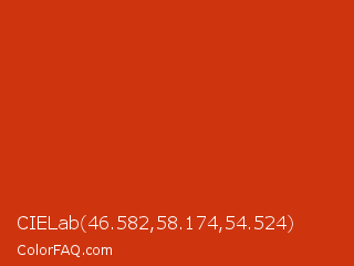 CIELab 46.582,58.174,54.524 Color is a normal red color and the nearest color is Sinopia #cb410b. Hex code #ce350f and RGB value is rgb(206,53,15). In RGB color space, this color is composed of 81% red, 21% green, 6% blue, In CMYK color space, this color is composed of 0% cyan, 74% magenta, 93% yellow , 19% black , In HSL color space, this color has a hue angle of 12° , 86% saturation and 43% lightness.
