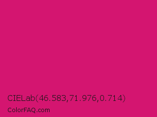 CIELab 46.583,71.976,0.714 Color is a normal rose color and the nearest color is Dogwood Rose #d71868. Hex code #d41570 and RGB value is rgb(212,21,112). In RGB color space, this color is composed of 83% red, 8% green, 44% blue, In CMYK color space, this color is composed of 0% cyan, 90% magenta, 47% yellow , 17% black , In HSL color space, this color has a hue angle of 331° , 82% saturation and 46% lightness.