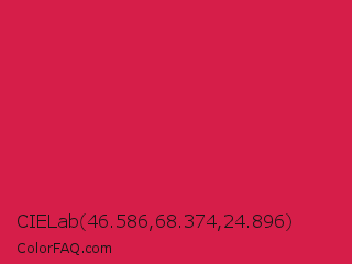 CIELab 46.586,68.374,24.896 Color is a normal red color and the nearest color is Rusty Red #da2c43. Hex code #d61e49 and RGB value is rgb(214,30,73). In RGB color space, this color is composed of 84% red, 12% green, 29% blue, In CMYK color space, this color is composed of 0% cyan, 86% magenta, 66% yellow , 16% black , In HSL color space, this color has a hue angle of 346° , 75% saturation and 48% lightness.