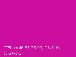 CIELab 46.58,75.93,-26.816 Color is a normal magenta color and the nearest color is Red Violet #c71585. Hex code #cd0d9d and RGB value is rgb(205,13,157). In RGB color space, this color is composed of 80% red, 5% green, 62% blue, In CMYK color space, this color is composed of 0% cyan, 94% magenta, 23% yellow , 20% black , In HSL color space, this color has a hue angle of 315° , 88% saturation and 43% lightness.