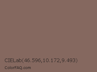 CIELab 46.596,10.172,9.493 Color is a normal red color and the nearest color is Sand Dune #826f65. Hex code #85685f and RGB value is rgb(133,104,95). In RGB color space, this color is composed of 52% red, 41% green, 37% blue, In CMYK color space, this color is composed of 0% cyan, 22% magenta, 29% yellow , 48% black , In HSL color space, this color has a hue angle of 14° , 17% saturation and 45% lightness.