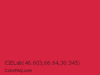 CIELab 46.603,66.64,30.345 Color is a normal red color and the nearest color is Rusty Red #da2c43. Hex code #d52340 and RGB value is rgb(213,35,64). In RGB color space, this color is composed of 84% red, 14% green, 25% blue, In CMYK color space, this color is composed of 0% cyan, 84% magenta, 70% yellow , 16% black , In HSL color space, this color has a hue angle of 350° , 72% saturation and 49% lightness.
