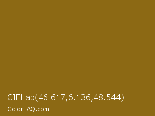 CIELab 46.617,6.136,48.544 Color is a normal orange color and the nearest color is Corn Harvest #8b6b0b. Hex code #8c6914 and RGB value is rgb(140,105,20). In RGB color space, this color is composed of 55% red, 41% green, 8% blue, In CMYK color space, this color is composed of 0% cyan, 25% magenta, 86% yellow , 45% black , In HSL color space, this color has a hue angle of 43° , 75% saturation and 31% lightness.