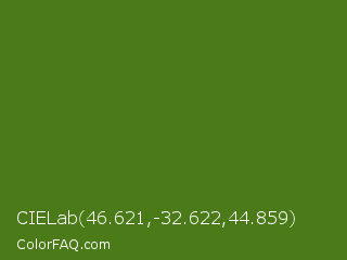 CIELab 46.621,-32.622,44.859 Color is a dark green color and the nearest color is Sap Green #507d2a. Hex code #4b7b19 and RGB value is rgb(75,123,25). In RGB color space, this color is composed of 29% red, 48% green, 10% blue, In CMYK color space, this color is composed of 39% cyan, 0% magenta, 80% yellow , 52% black , In HSL color space, this color has a hue angle of 89° , 66% saturation and 29% lightness.