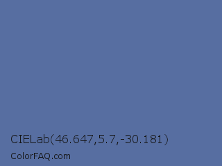 CIELab 46.647,5.7,-30.181 Color is a normal blue color and the nearest color is Waikawa Gray #5a6e9c. Hex code #576ea1 and RGB value is rgb(87,110,161). In RGB color space, this color is composed of 34% red, 43% green, 63% blue, In CMYK color space, this color is composed of 46% cyan, 32% magenta, 0% yellow , 37% black , In HSL color space, this color has a hue angle of 221° , 30% saturation and 49% lightness.