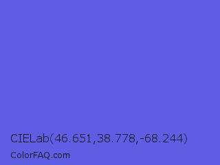 CIELab 46.651,38.778,-68.244 Color is a light blue color and the nearest color is Majorelle Blue #6050dc. Hex code #5e5de3 and RGB value is rgb(94,93,227). In RGB color space, this color is composed of 37% red, 36% green, 89% blue, In CMYK color space, this color is composed of 59% cyan, 59% magenta, 0% yellow , 11% black , In HSL color space, this color has a hue angle of 240° , 71% saturation and 63% lightness.