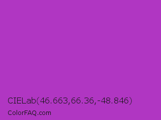 CIELab 46.663,66.36,-48.846 Color is a normal magenta color and the nearest color is Dark Orchid #9932cc. Hex code #b036c2 and RGB value is rgb(176,54,194). In RGB color space, this color is composed of 69% red, 21% green, 76% blue, In CMYK color space, this color is composed of 9% cyan, 72% magenta, 0% yellow , 24% black , In HSL color space, this color has a hue angle of 292° , 56% saturation and 49% lightness.
