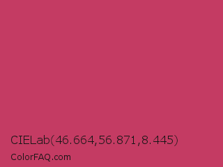 CIELab 46.664,56.871,8.445 Color is a normal rose color and the nearest color is Brick Red #cb4154. Hex code #c43b63 and RGB value is rgb(196,59,99). In RGB color space, this color is composed of 77% red, 23% green, 39% blue, In CMYK color space, this color is composed of 0% cyan, 70% magenta, 49% yellow , 23% black , In HSL color space, this color has a hue angle of 342° , 54% saturation and 50% lightness.