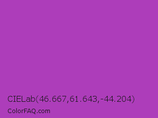 CIELab 46.667,61.643,-44.204 Color is a normal magenta color and the nearest color is Purple Plum #9c51b6. Hex code #ad3dba and RGB value is rgb(173,61,186). In RGB color space, this color is composed of 68% red, 24% green, 73% blue, In CMYK color space, this color is composed of 7% cyan, 67% magenta, 0% yellow , 27% black , In HSL color space, this color has a hue angle of 294° , 51% saturation and 48% lightness.
