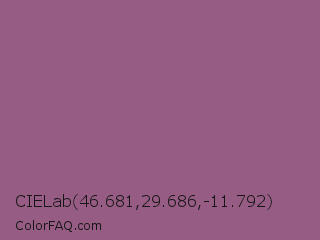 CIELab 46.681,29.686,-11.792 Color is a normal magenta color and the nearest color is Antique Fuchsia #915c83. Hex code #965c83 and RGB value is rgb(150,92,131). In RGB color space, this color is composed of 59% red, 36% green, 51% blue, In CMYK color space, this color is composed of 0% cyan, 39% magenta, 13% yellow , 41% black , In HSL color space, this color has a hue angle of 320° , 24% saturation and 47% lightness.