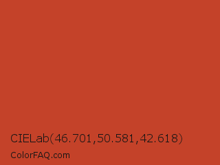 CIELab 46.701,50.581,42.618 Color is a normal red color and the nearest color is Dark Pastel Red #c23b22. Hex code #c44229 and RGB value is rgb(196,66,41). In RGB color space, this color is composed of 77% red, 26% green, 16% blue, In CMYK color space, this color is composed of 0% cyan, 66% magenta, 79% yellow , 23% black , In HSL color space, this color has a hue angle of 10° , 65% saturation and 46% lightness.