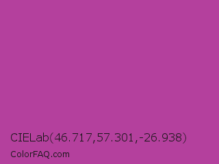 CIELab 46.717,57.301,-26.938 Color is a normal magenta color and the nearest color is Byzantine #bd33a4. Hex code #b4409d and RGB value is rgb(180,64,157). In RGB color space, this color is composed of 71% red, 25% green, 62% blue, In CMYK color space, this color is composed of 0% cyan, 64% magenta, 13% yellow , 29% black , In HSL color space, this color has a hue angle of 312° , 48% saturation and 48% lightness.