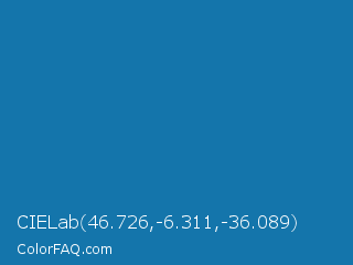 CIELab 46.726,-6.311,-36.089 Color is a normal blue color and the nearest color is Green Blue #1164b4. Hex code #1475ab and RGB value is rgb(20,117,171). In RGB color space, this color is composed of 8% red, 46% green, 67% blue, In CMYK color space, this color is composed of 88% cyan, 32% magenta, 0% yellow , 33% black , In HSL color space, this color has a hue angle of 201° , 79% saturation and 37% lightness.