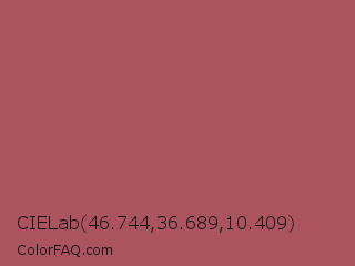 CIELab 46.744,36.689,10.409 Color is a normal red color and the nearest color is Deep Puce #a95c68. Hex code #ab545f and RGB value is rgb(171,84,95). In RGB color space, this color is composed of 67% red, 33% green, 37% blue, In CMYK color space, this color is composed of 0% cyan, 51% magenta, 44% yellow , 33% black , In HSL color space, this color has a hue angle of 352° , 34% saturation and 50% lightness.