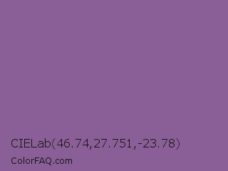 CIELab 46.74,27.751,-23.78 Color is a normal purple color and the nearest color is Trendy Pink #8c6495. Hex code #8a5f97 and RGB value is rgb(138,95,151). In RGB color space, this color is composed of 54% red, 37% green, 59% blue, In CMYK color space, this color is composed of 9% cyan, 37% magenta, 0% yellow , 41% black , In HSL color space, this color has a hue angle of 286° , 23% saturation and 48% lightness.