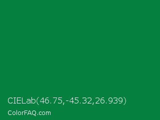 CIELab 46.75,-45.32,26.939 Color is a dark green color and the nearest color is Salem #097f4b. Hex code #05803f and RGB value is rgb(5,128,63). In RGB color space, this color is composed of 2% red, 50% green, 25% blue, In CMYK color space, this color is composed of 96% cyan, 0% magenta, 51% yellow , 50% black , In HSL color space, this color has a hue angle of 148° , 92% saturation and 26% lightness.