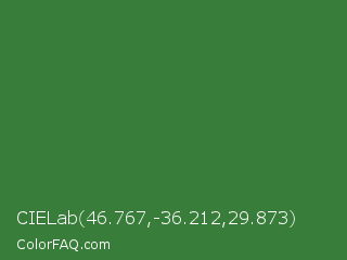 CIELab 46.767,-36.212,29.873 Color is a normal green color and the nearest color is Killarney #3a6a47. Hex code #397d3a and RGB value is rgb(57,125,58). In RGB color space, this color is composed of 22% red, 49% green, 23% blue, In CMYK color space, this color is composed of 54% cyan, 0% magenta, 54% yellow , 51% black , In HSL color space, this color has a hue angle of 121° , 37% saturation and 36% lightness.