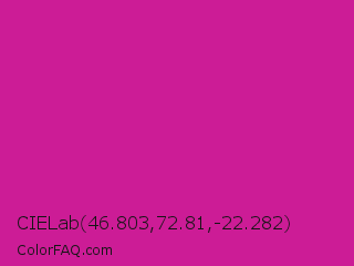 CIELab 46.803,72.81,-22.282 Color is a normal magenta color and the nearest color is Royal Fuchsia #ca2c92. Hex code #cc1c96 and RGB value is rgb(204,28,150). In RGB color space, this color is composed of 80% red, 11% green, 59% blue, In CMYK color space, this color is composed of 0% cyan, 86% magenta, 26% yellow , 20% black , In HSL color space, this color has a hue angle of 318° , 76% saturation and 45% lightness.