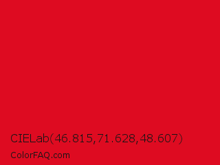 CIELab 46.815,71.628,48.607 Color is a normal red color and the nearest color is Cadmium Red #e30022. Hex code #de0b21 and RGB value is rgb(222,11,33). In RGB color space, this color is composed of 87% red, 4% green, 13% blue, In CMYK color space, this color is composed of 0% cyan, 95% magenta, 85% yellow , 13% black , In HSL color space, this color has a hue angle of 354° , 91% saturation and 46% lightness.