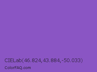 CIELab 46.824,43.884,-50.033 Color is a normal violet color and the nearest color is Fuchsia Blue #7a58c1. Hex code #8a55c4 and RGB value is rgb(138,85,196). In RGB color space, this color is composed of 54% red, 33% green, 77% blue, In CMYK color space, this color is composed of 30% cyan, 57% magenta, 0% yellow , 23% black , In HSL color space, this color has a hue angle of 269° , 48% saturation and 55% lightness.