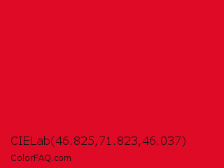CIELab 46.825,71.823,46.037 Color is a normal red color and the nearest color is Medium Candy Apple Red #e2062c. Hex code #de0a26 and RGB value is rgb(222,10,38). In RGB color space, this color is composed of 87% red, 4% green, 15% blue, In CMYK color space, this color is composed of 0% cyan, 95% magenta, 83% yellow , 13% black , In HSL color space, this color has a hue angle of 352° , 91% saturation and 45% lightness.