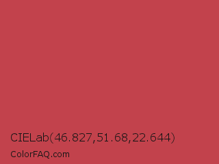 CIELab 46.827,51.68,22.644 Color is a normal red color and the nearest color is English Vermillion #cc474b. Hex code #c2424c and RGB value is rgb(194,66,76). In RGB color space, this color is composed of 76% red, 26% green, 30% blue, In CMYK color space, this color is composed of 0% cyan, 66% magenta, 61% yellow , 24% black , In HSL color space, this color has a hue angle of 355° , 51% saturation and 51% lightness.