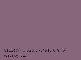 CIELab 46.828,17.491,-6.946 Color is a normal magenta color and the nearest color is Chinese Violet #856088. Hex code #87657b and RGB value is rgb(135,101,123). In RGB color space, this color is composed of 53% red, 40% green, 48% blue, In CMYK color space, this color is composed of 0% cyan, 25% magenta, 9% yellow , 47% black , In HSL color space, this color has a hue angle of 321° , 14% saturation and 46% lightness.