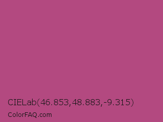 CIELab 46.853,48.883,-9.315 Color is a normal rose color and the nearest color is Mystic Maroon #ad4379. Hex code #b34980 and RGB value is rgb(179,73,128). In RGB color space, this color is composed of 70% red, 29% green, 50% blue, In CMYK color space, this color is composed of 0% cyan, 59% magenta, 28% yellow , 30% black , In HSL color space, this color has a hue angle of 329° , 42% saturation and 49% lightness.