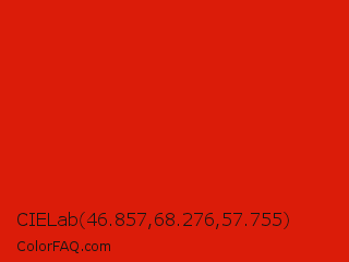 CIELab 46.857,68.276,57.755 Color is a normal red color and the nearest color is Maximum Red #d92121. Hex code #db1c09 and RGB value is rgb(219,28,9). In RGB color space, this color is composed of 86% red, 11% green, 4% blue, In CMYK color space, this color is composed of 0% cyan, 87% magenta, 96% yellow , 14% black , In HSL color space, this color has a hue angle of 5° , 92% saturation and 45% lightness.