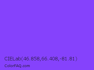 CIELab 46.858,66.408,-81.81 Color is a light violet color and the nearest color is Navy Purple #9457eb. Hex code #8542fc and RGB value is rgb(133,66,252). In RGB color space, this color is composed of 52% red, 26% green, 99% blue, In CMYK color space, this color is composed of 47% cyan, 74% magenta, 0% yellow , 1% black , In HSL color space, this color has a hue angle of 262° , 97% saturation and 62% lightness.
