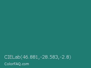 CIELab 46.881,-28.583,-2.8 Color is a dark cyan color and the nearest color is Elm #1c7c7d. Hex code #1e7c73 and RGB value is rgb(30,124,115). In RGB color space, this color is composed of 12% red, 49% green, 45% blue, In CMYK color space, this color is composed of 76% cyan, 0% magenta, 7% yellow , 51% black , In HSL color space, this color has a hue angle of 174° , 61% saturation and 30% lightness.