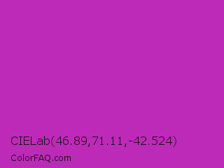 CIELab 46.89,71.11,-42.524 Color is a normal magenta color and the nearest color is Byzantine #bd33a4. Hex code #bd2ab8 and RGB value is rgb(189,42,184). In RGB color space, this color is composed of 74% red, 16% green, 72% blue, In CMYK color space, this color is composed of 0% cyan, 78% magenta, 3% yellow , 26% black , In HSL color space, this color has a hue angle of 302° , 64% saturation and 45% lightness.