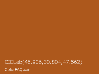 CIELab 46.906,30.804,47.562 Color is a normal orange color and the nearest color is Desert #ae6020. Hex code #ad581c and RGB value is rgb(173,88,28). In RGB color space, this color is composed of 68% red, 35% green, 11% blue, In CMYK color space, this color is composed of 0% cyan, 49% magenta, 84% yellow , 32% black , In HSL color space, this color has a hue angle of 25° , 72% saturation and 39% lightness.