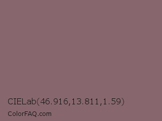 CIELab 46.916,13.811,1.59 Color is a normal red color and the nearest color is Falcon #7f626d. Hex code #87676d and RGB value is rgb(135,103,109). In RGB color space, this color is composed of 53% red, 40% green, 43% blue, In CMYK color space, this color is composed of 0% cyan, 24% magenta, 19% yellow , 47% black , In HSL color space, this color has a hue angle of 349° , 13% saturation and 47% lightness.