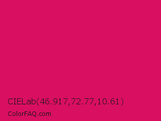 CIELab 46.917,72.77,10.61 Color is a normal rose color and the nearest color is Ruby #e0115f. Hex code #d90f61 and RGB value is rgb(217,15,97). In RGB color space, this color is composed of 85% red, 6% green, 38% blue, In CMYK color space, this color is composed of 0% cyan, 93% magenta, 55% yellow , 15% black , In HSL color space, this color has a hue angle of 336° , 87% saturation and 45% lightness.