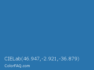 CIELab 46.947,-2.921,-36.879 Color is a normal blue color and the nearest color is Astral #327da0. Hex code #2974ad and RGB value is rgb(41,116,173). In RGB color space, this color is composed of 16% red, 45% green, 68% blue, In CMYK color space, this color is composed of 76% cyan, 33% magenta, 0% yellow , 32% black , In HSL color space, this color has a hue angle of 206° , 62% saturation and 42% lightness.