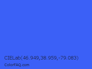 CIELab 46.949,38.959,-79.083 Color is a normal blue color and the nearest color is Ultramarine Blue #4166f5. Hex code #3a60f7 and RGB value is rgb(58,96,247). In RGB color space, this color is composed of 23% red, 38% green, 97% blue, In CMYK color space, this color is composed of 77% cyan, 61% magenta, 0% yellow , 3% black , In HSL color space, this color has a hue angle of 228° , 92% saturation and 60% lightness.