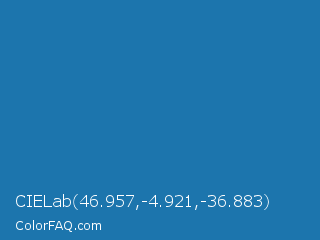 CIELab 46.957,-4.921,-36.883 Color is a normal blue color and the nearest color is Green Blue #1164b4. Hex code #1c75ad and RGB value is rgb(28,117,173). In RGB color space, this color is composed of 11% red, 46% green, 68% blue, In CMYK color space, this color is composed of 84% cyan, 32% magenta, 0% yellow , 32% black , In HSL color space, this color has a hue angle of 203° , 72% saturation and 39% lightness.