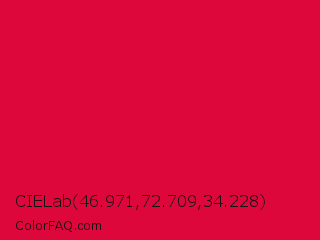 CIELab 46.971,72.709,34.228 Color is a normal red color and the nearest color is Rich Carmine #d70040. Hex code #de073b and RGB value is rgb(222,7,59). In RGB color space, this color is composed of 87% red, 3% green, 23% blue, In CMYK color space, this color is composed of 0% cyan, 97% magenta, 73% yellow , 13% black , In HSL color space, this color has a hue angle of 345° , 94% saturation and 45% lightness.