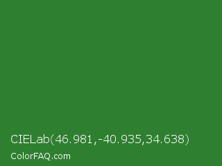 CIELab 46.981,-40.935,34.638 Color is a normal green color and the nearest color is Forest Green #228b22. Hex code #2f7f31 and RGB value is rgb(47,127,49). In RGB color space, this color is composed of 18% red, 50% green, 19% blue, In CMYK color space, this color is composed of 63% cyan, 0% magenta, 61% yellow , 50% black , In HSL color space, this color has a hue angle of 122° , 46% saturation and 34% lightness.