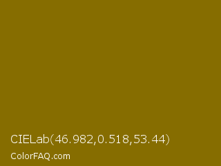 CIELab 46.982,0.518,53.44 Color is a dark yellow color and the nearest color is Corn Harvest #8b6b0b. Hex code #866d00 and RGB value is rgb(134,109,0). In RGB color space, this color is composed of 53% red, 43% green, 0% blue, In CMYK color space, this color is composed of 0% cyan, 19% magenta, 100% yellow , 47% black , In HSL color space, this color has a hue angle of 49° , 100% saturation and 26% lightness.