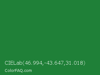 CIELab 46.994,-43.647,31.018 Color is a normal green color and the nearest color is Dark Spring Green #177245. Hex code #1f8038 and RGB value is rgb(31,128,56). In RGB color space, this color is composed of 12% red, 50% green, 22% blue, In CMYK color space, this color is composed of 76% cyan, 0% magenta, 56% yellow , 50% black , In HSL color space, this color has a hue angle of 135° , 61% saturation and 31% lightness.