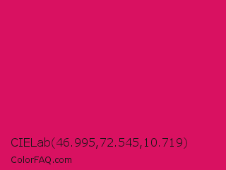 CIELab 46.995,72.545,10.719 Color is a normal rose color and the nearest color is Ruby #e0115f. Hex code #d91161 and RGB value is rgb(217,17,97). In RGB color space, this color is composed of 85% red, 7% green, 38% blue, In CMYK color space, this color is composed of 0% cyan, 92% magenta, 55% yellow , 15% black , In HSL color space, this color has a hue angle of 336° , 85% saturation and 46% lightness.