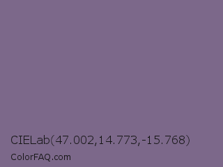 CIELab 47.002,14.773,-15.768 Color is a normal purple color and the nearest color is Rum #796989. Hex code #7c688a and RGB value is rgb(124,104,138). In RGB color space, this color is composed of 49% red, 41% green, 54% blue, In CMYK color space, this color is composed of 10% cyan, 25% magenta, 0% yellow , 46% black , In HSL color space, this color has a hue angle of 275° , 14% saturation and 47% lightness.