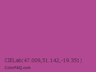 CIELab 47.009,51.142,-19.351 Color is a normal magenta color and the nearest color is Mulberry #c54b8c. Hex code #b14891 and RGB value is rgb(177,72,145). In RGB color space, this color is composed of 69% red, 28% green, 57% blue, In CMYK color space, this color is composed of 0% cyan, 59% magenta, 18% yellow , 31% black , In HSL color space, this color has a hue angle of 318° , 42% saturation and 49% lightness.