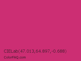 CIELab 47.013,64.897,-0.688 Color is a normal rose color and the nearest color is Telemagenta #cf3476. Hex code #cc2e73 and RGB value is rgb(204,46,115). In RGB color space, this color is composed of 80% red, 18% green, 45% blue, In CMYK color space, this color is composed of 0% cyan, 77% magenta, 44% yellow , 20% black , In HSL color space, this color has a hue angle of 334° , 63% saturation and 49% lightness.
