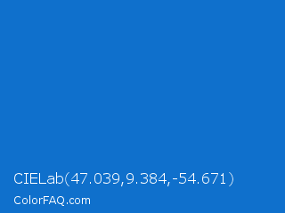 CIELab 47.039,9.384,-54.671 Color is a normal blue color and the nearest color is Bright Navy Blue #1974d2. Hex code #0f70cc and RGB value is rgb(15,112,204). In RGB color space, this color is composed of 6% red, 44% green, 80% blue, In CMYK color space, this color is composed of 93% cyan, 45% magenta, 0% yellow , 20% black , In HSL color space, this color has a hue angle of 209° , 86% saturation and 43% lightness.